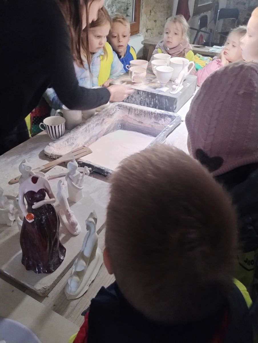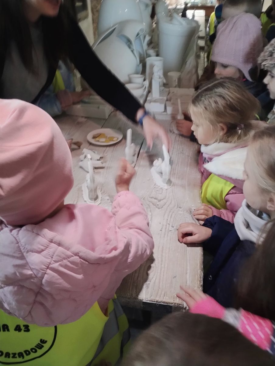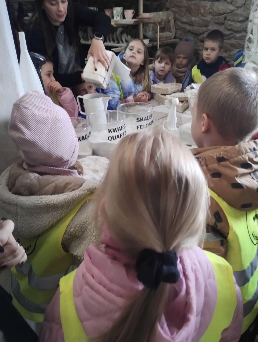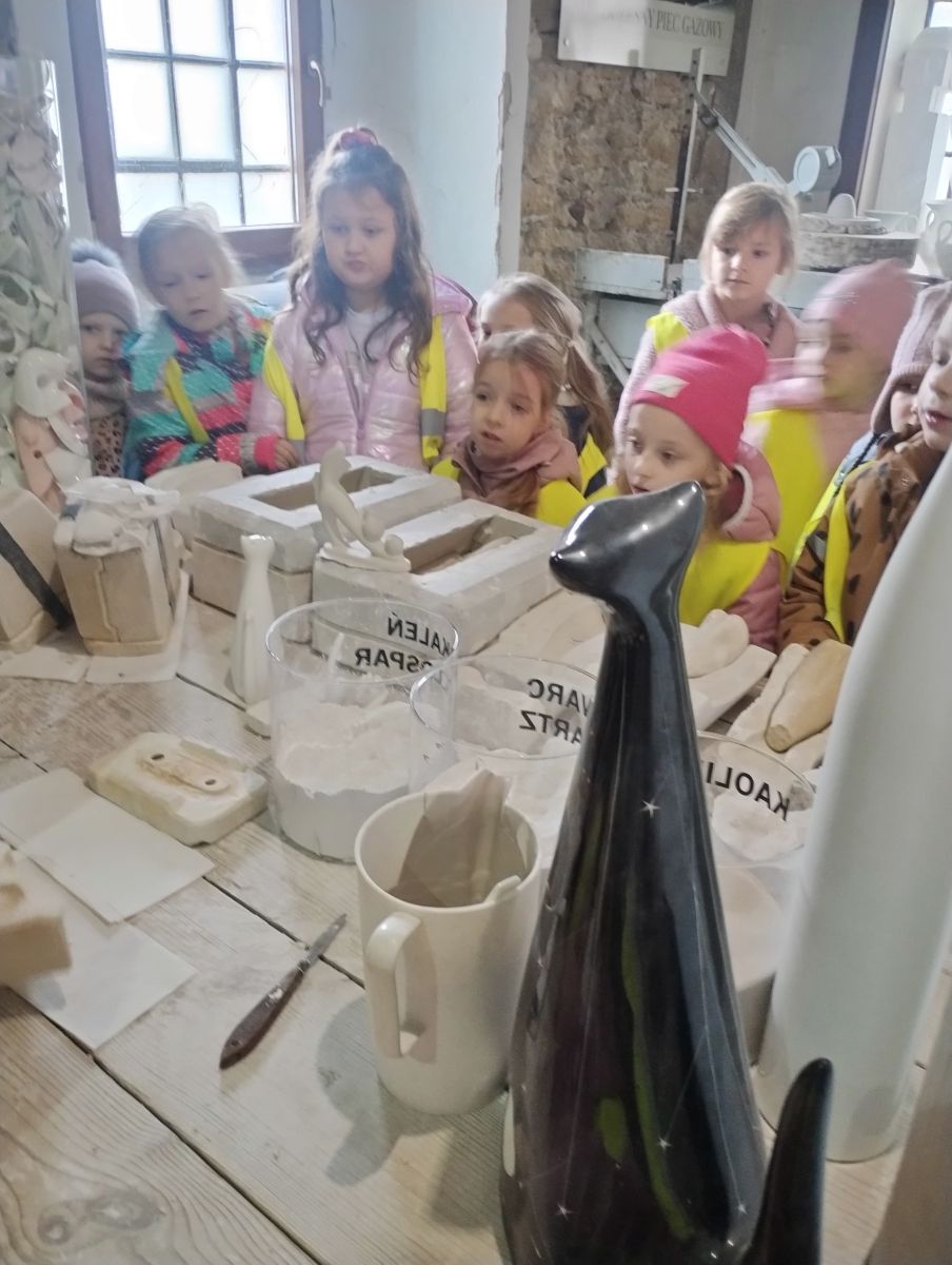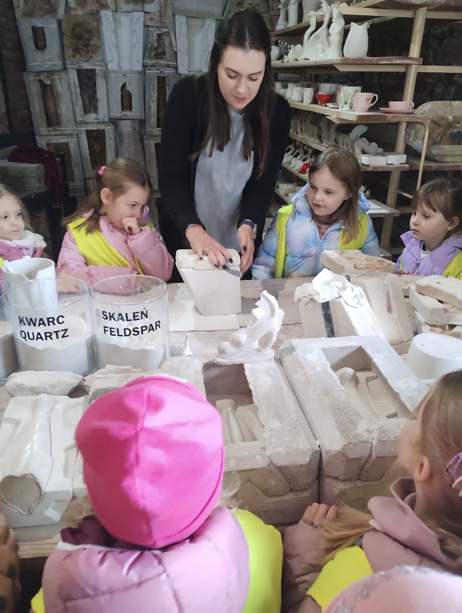 22 października 2025r. dzieci z grupy III i IV w ramach projektu "Dbając o wszechstronny rozwój dzieci - kierujemy przyszłość" odwiedziły Żywe Muzeum Porcelany w Ćmielowie. Przedszkolaki zwiedziły Muzeum, a także miały możliwość zobaczyć "na żywo" jak powstaje porcelana. Na przykładzie porcelanowej figurki kotka poznały wszystkie etapy produkcji porcelany. W czasie warsztatów każde dziecko wykonało własnoręcznie porcelanowa różyczkę, którą mogło zabrać na pamiątkę do domu.