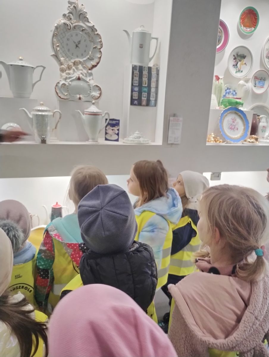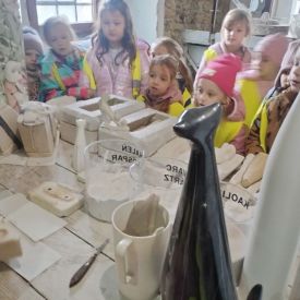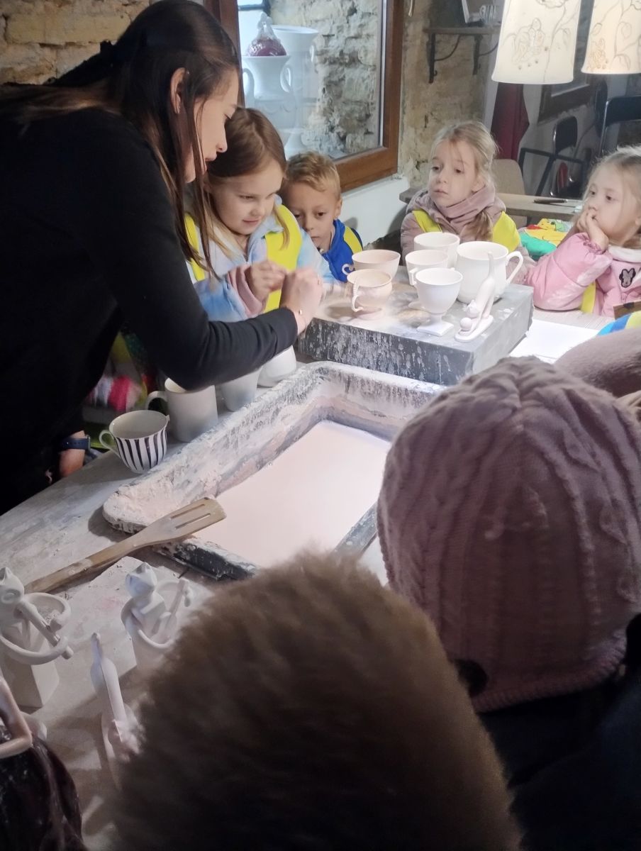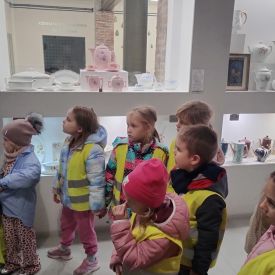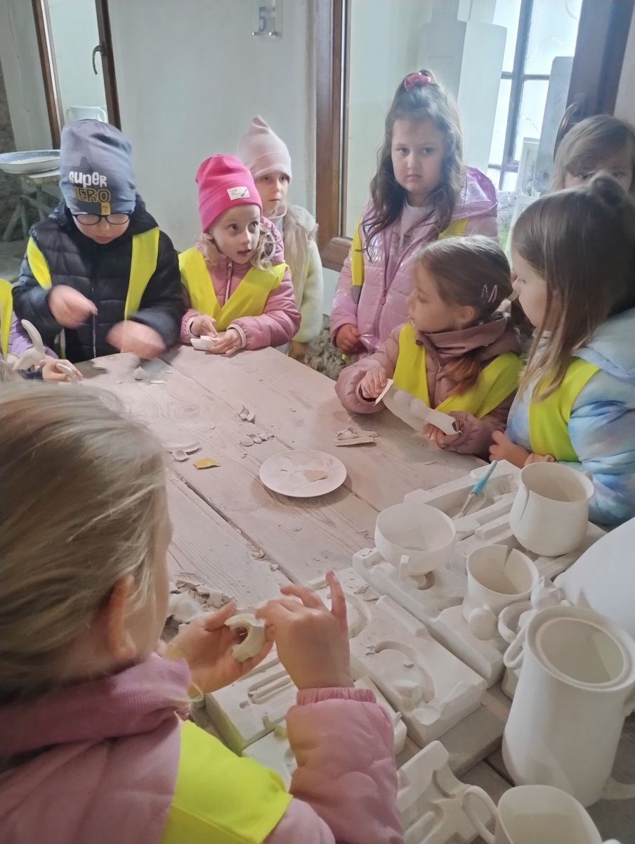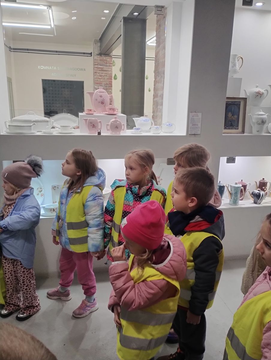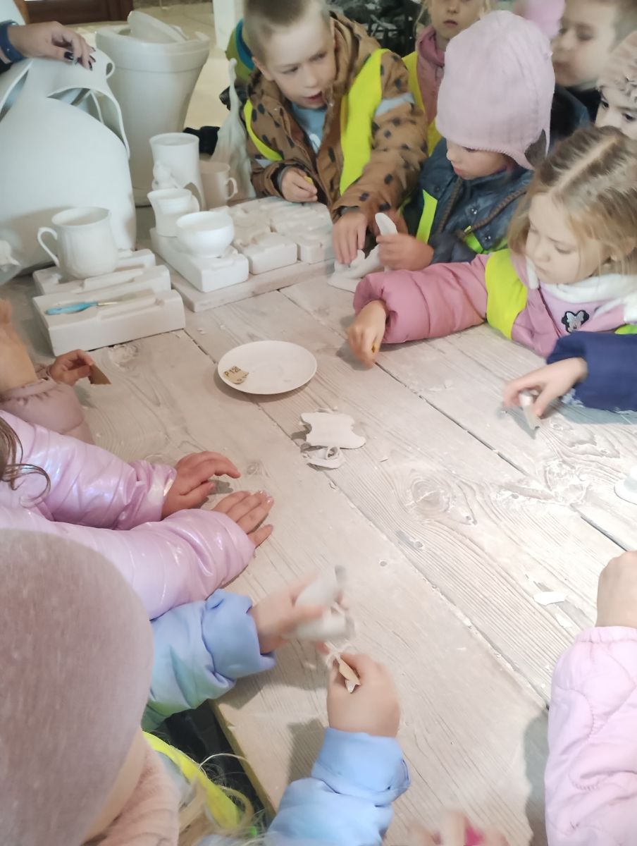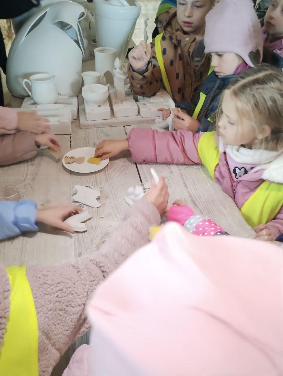 22 października 2025r. dzieci z grupy III i IV w ramach projektu "Dbając o wszechstronny rozwój dzieci - kierujemy przyszłość" odwiedziły Żywe Muzeum Porcelany w Ćmielowie. Przedszkolaki zwiedziły Muzeum, a także miały możliwość zobaczyć "na żywo" jak powstaje porcelana. Na przykładzie porcelanowej figurki kotka poznały wszystkie etapy produkcji porcelany. W czasie warsztatów każde dziecko wykonało własnoręcznie porcelanowa różyczkę, którą mogło zabrać na pamiątkę do domu.