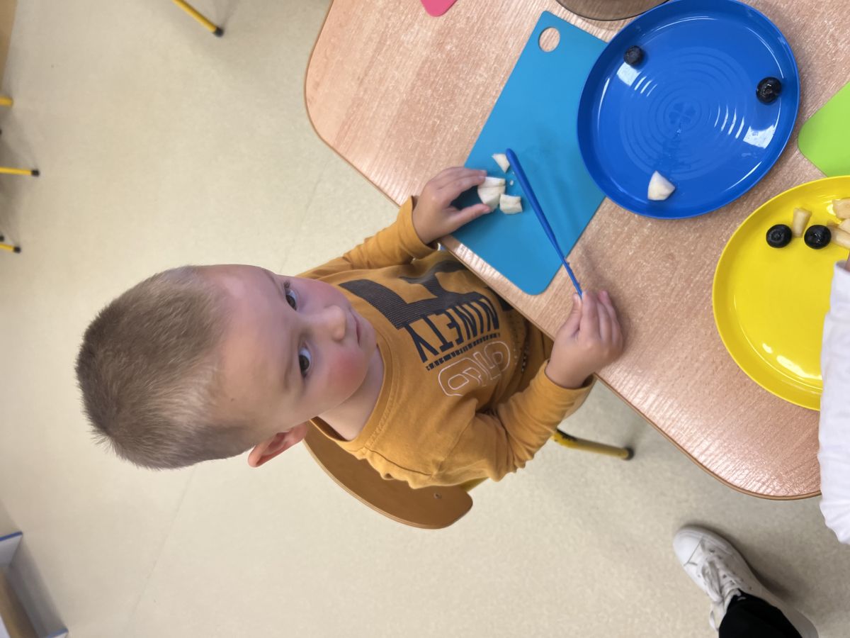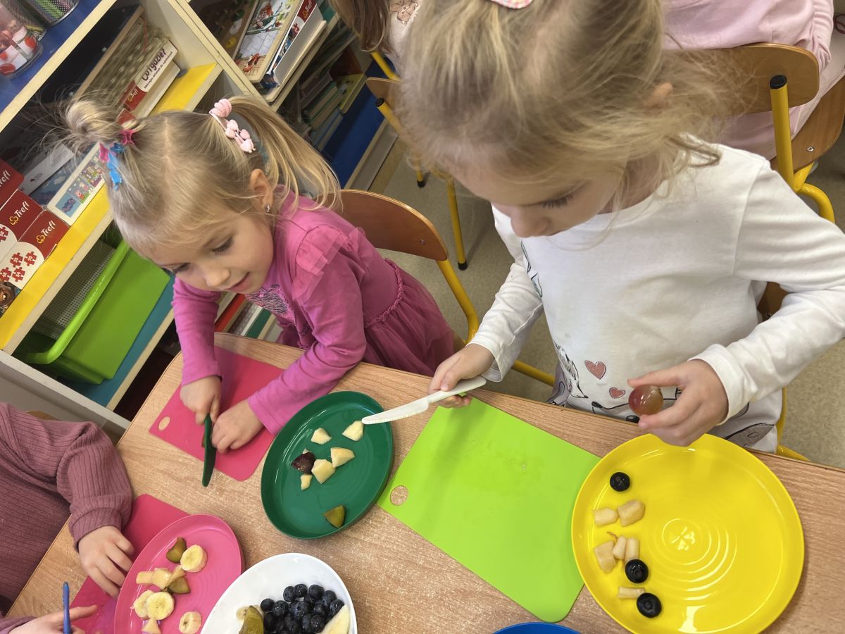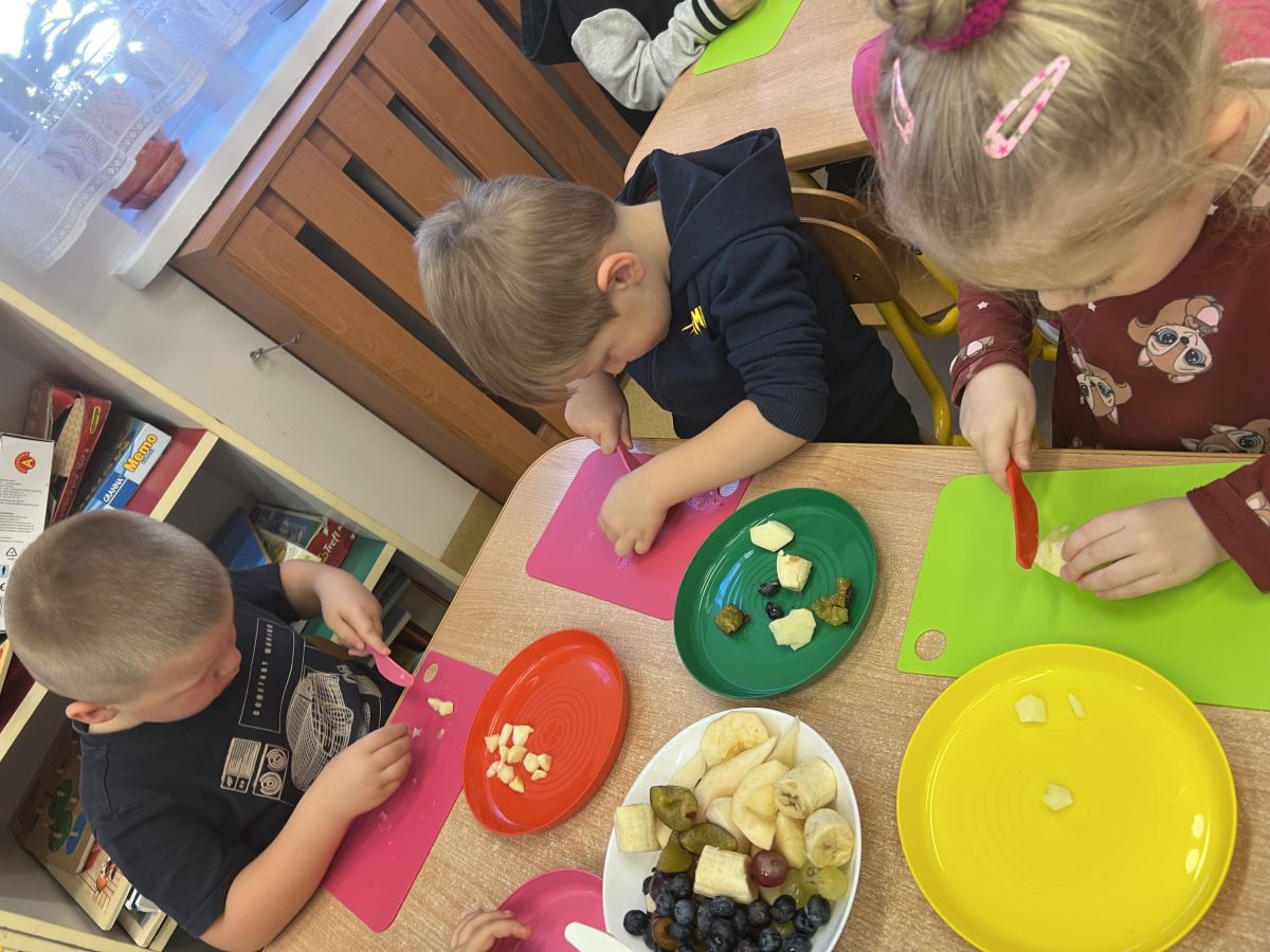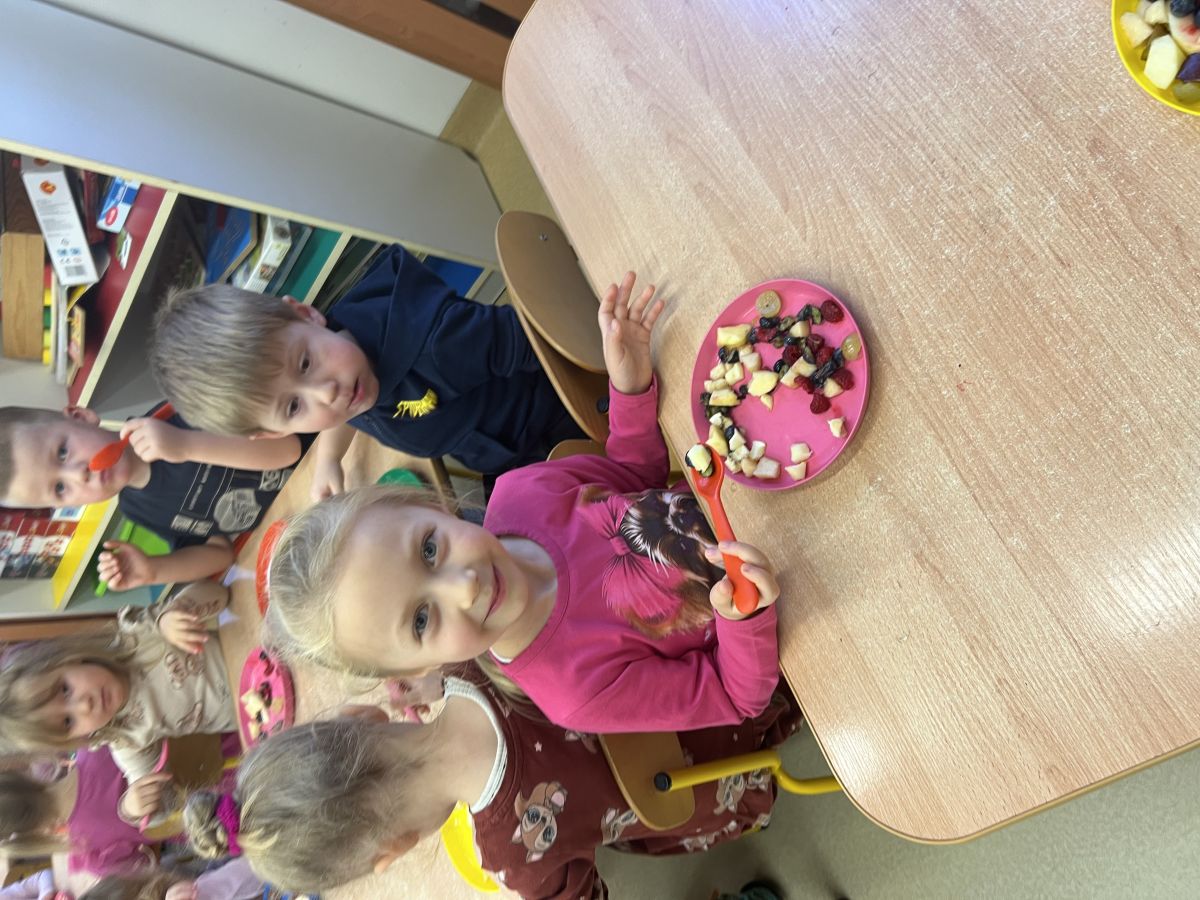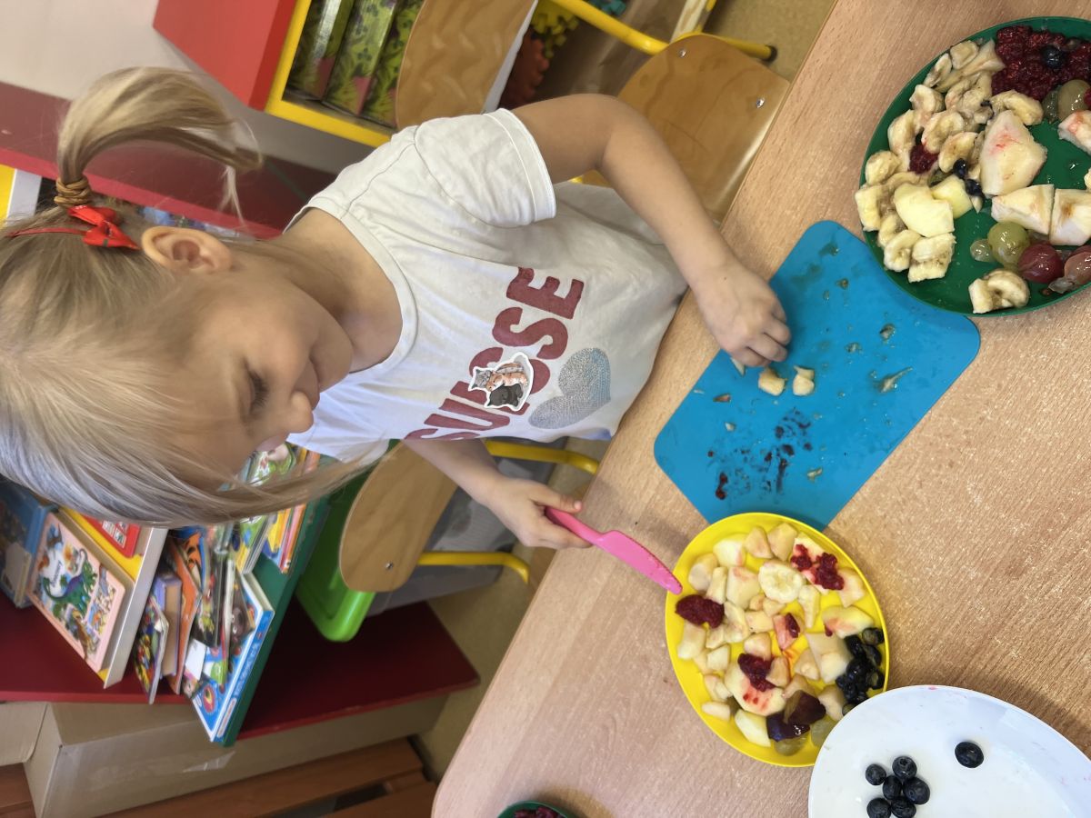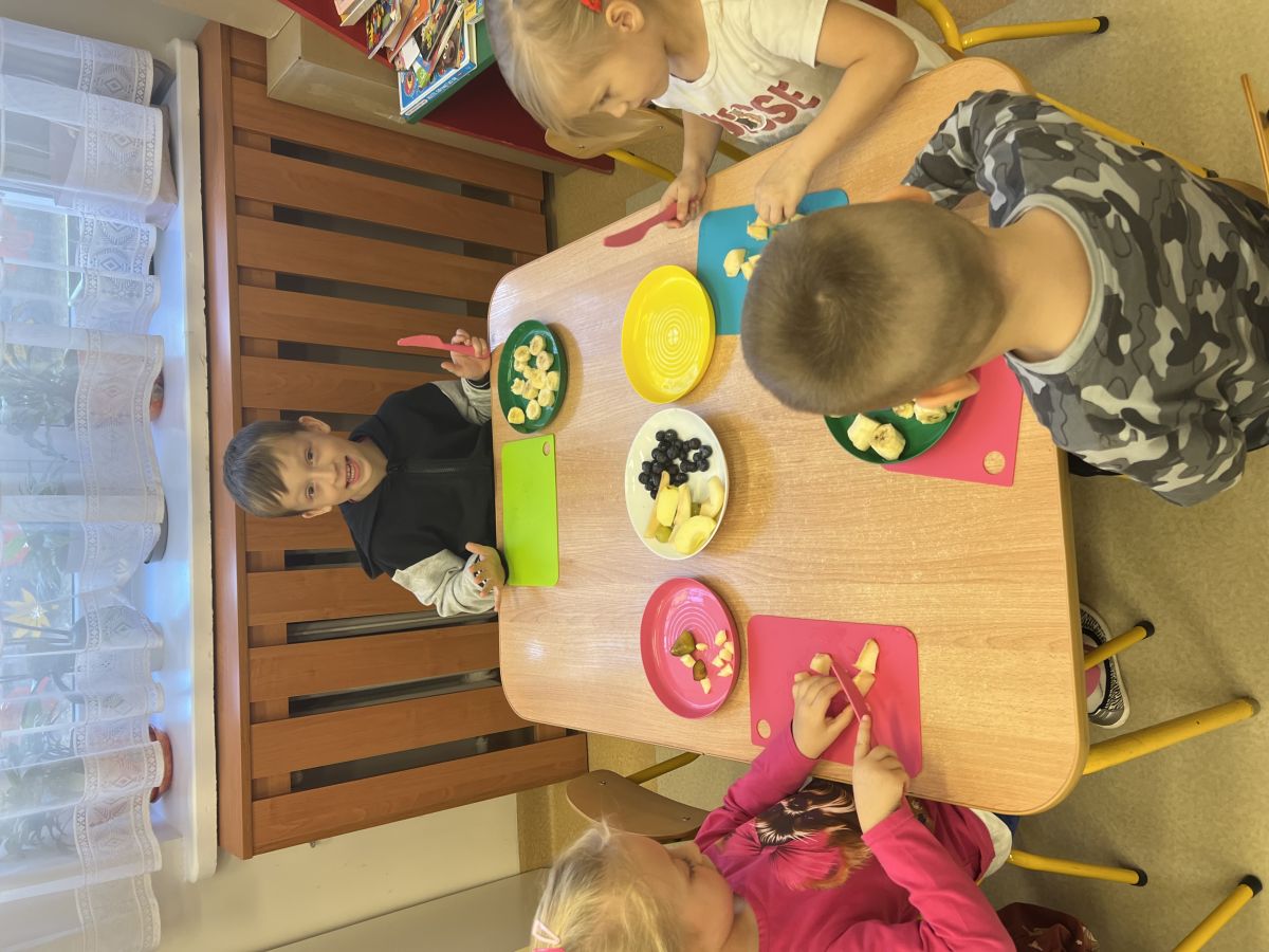 Dziś w grupie drugiej małe zuchy ćwiczyły swoje rączki podczas krojenia owoców na sałatkę owocową.Było pysznie 🥰