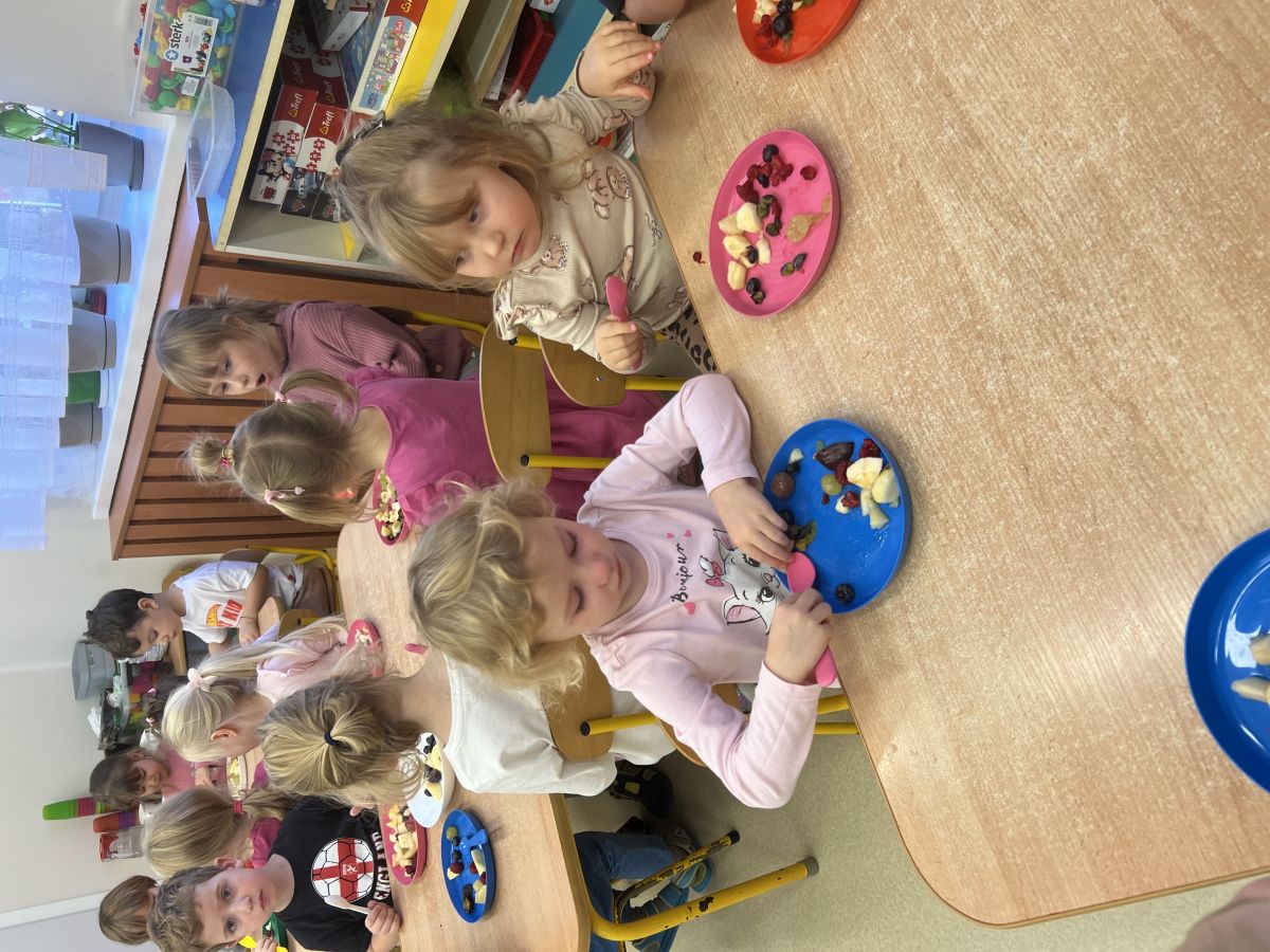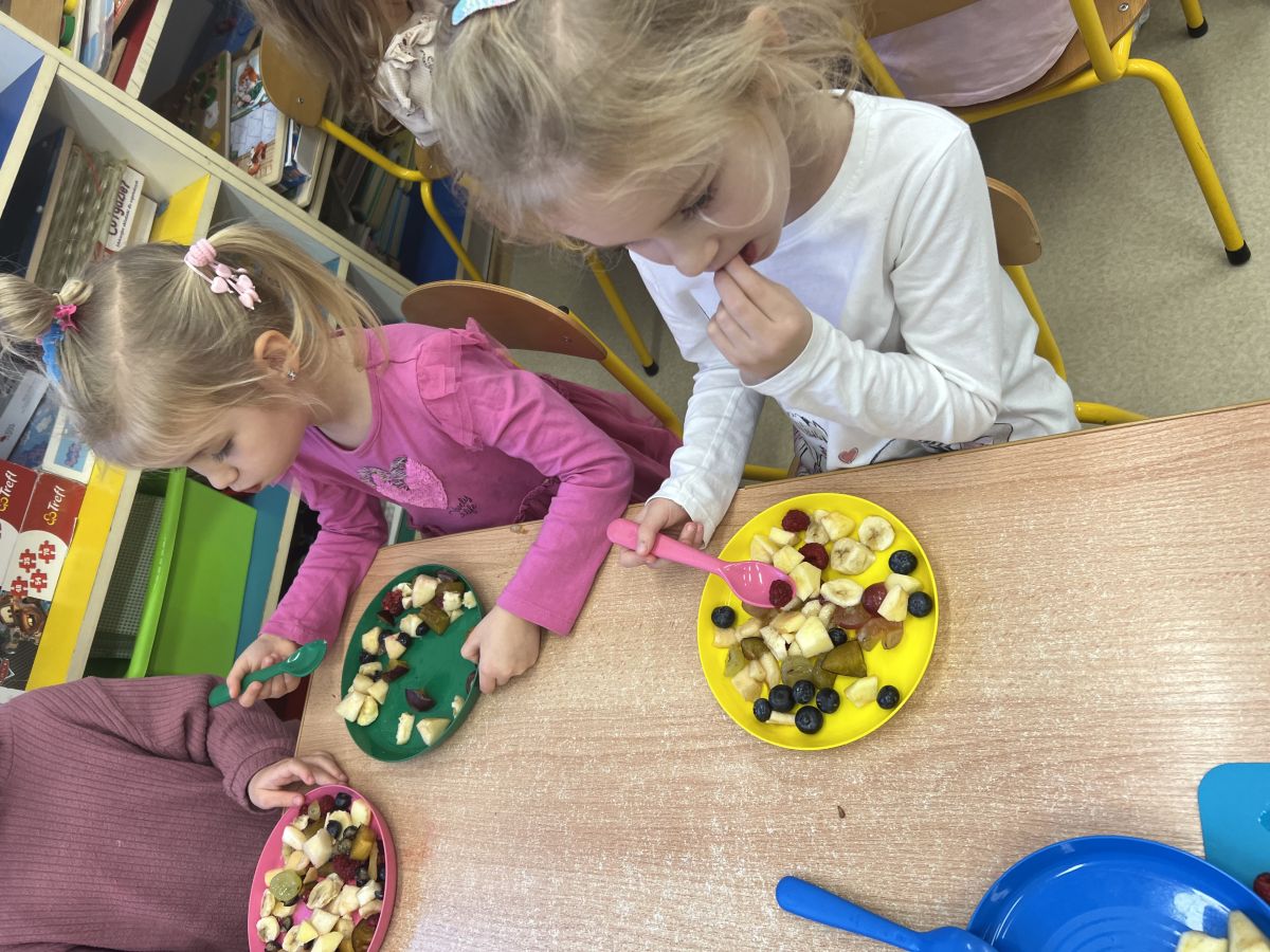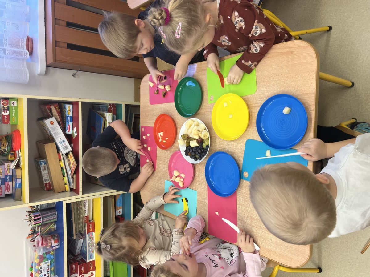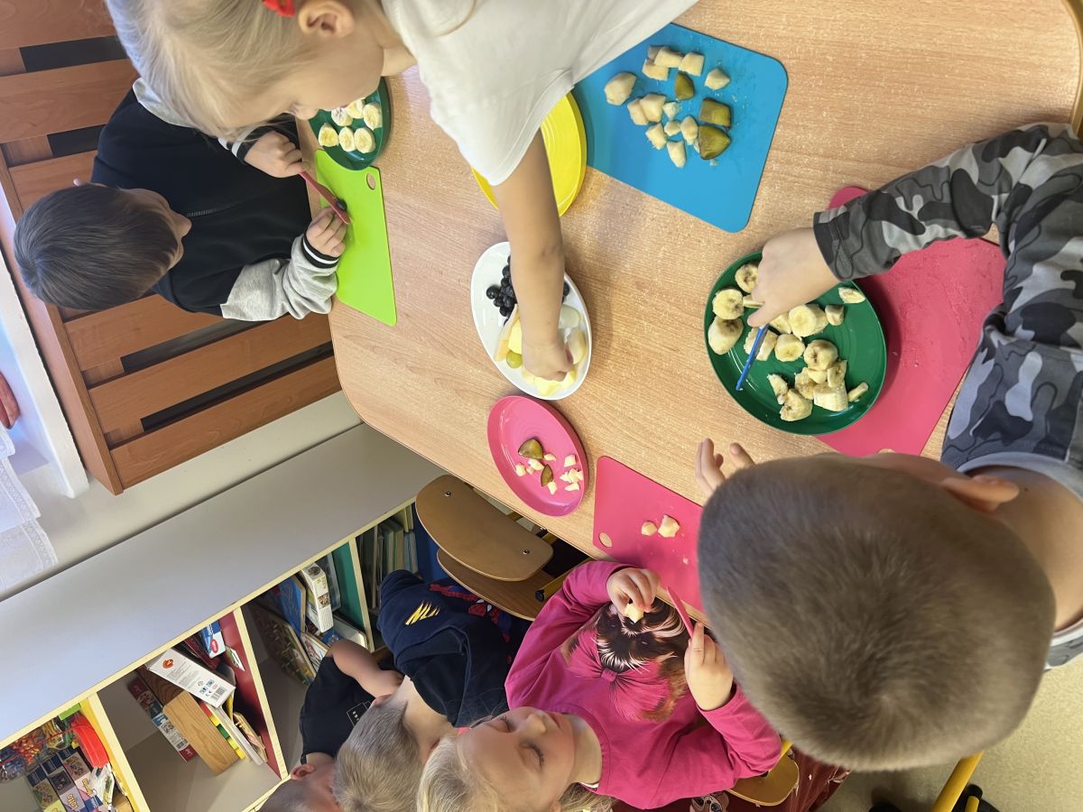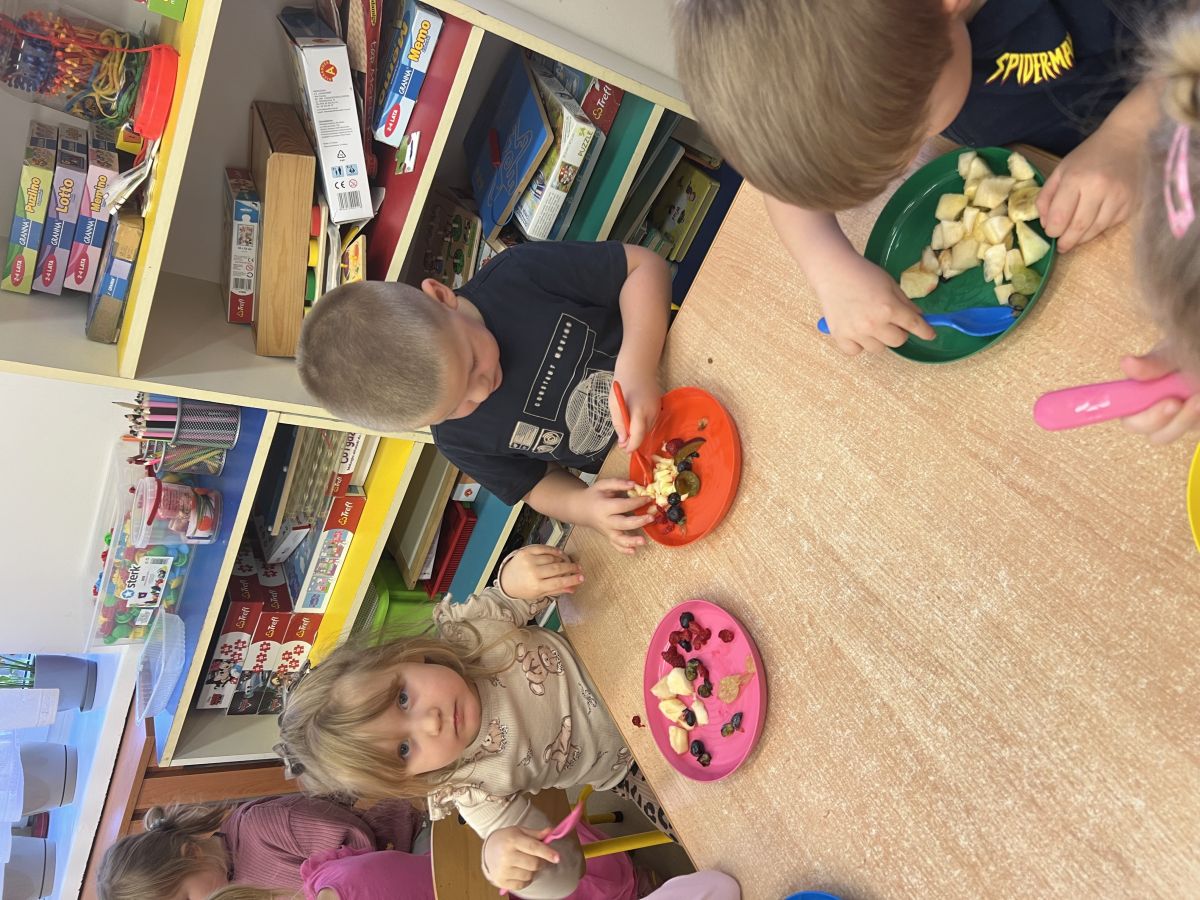 Dziś w grupie drugiej małe zuchy ćwiczyły swoje rączki podczas krojenia owoców na sałatkę owocową.Było pysznie 🥰