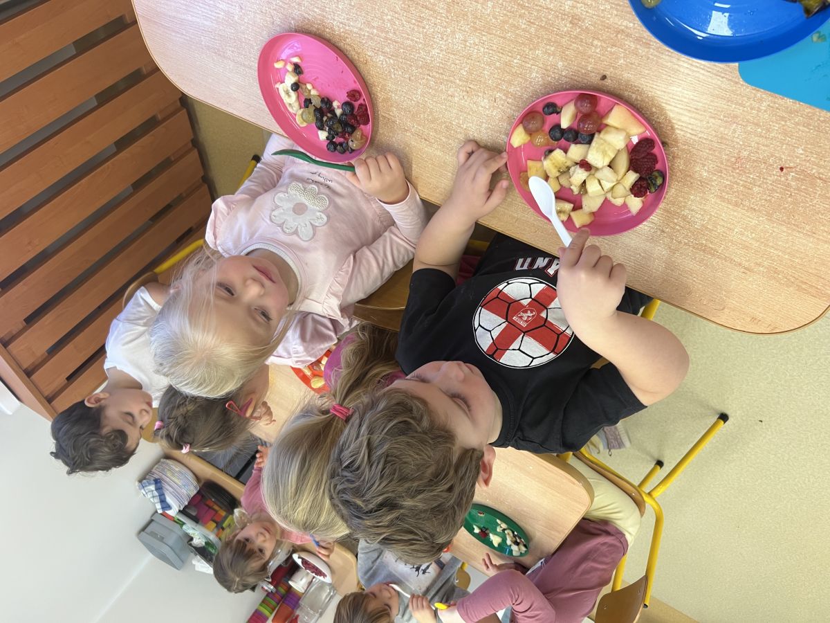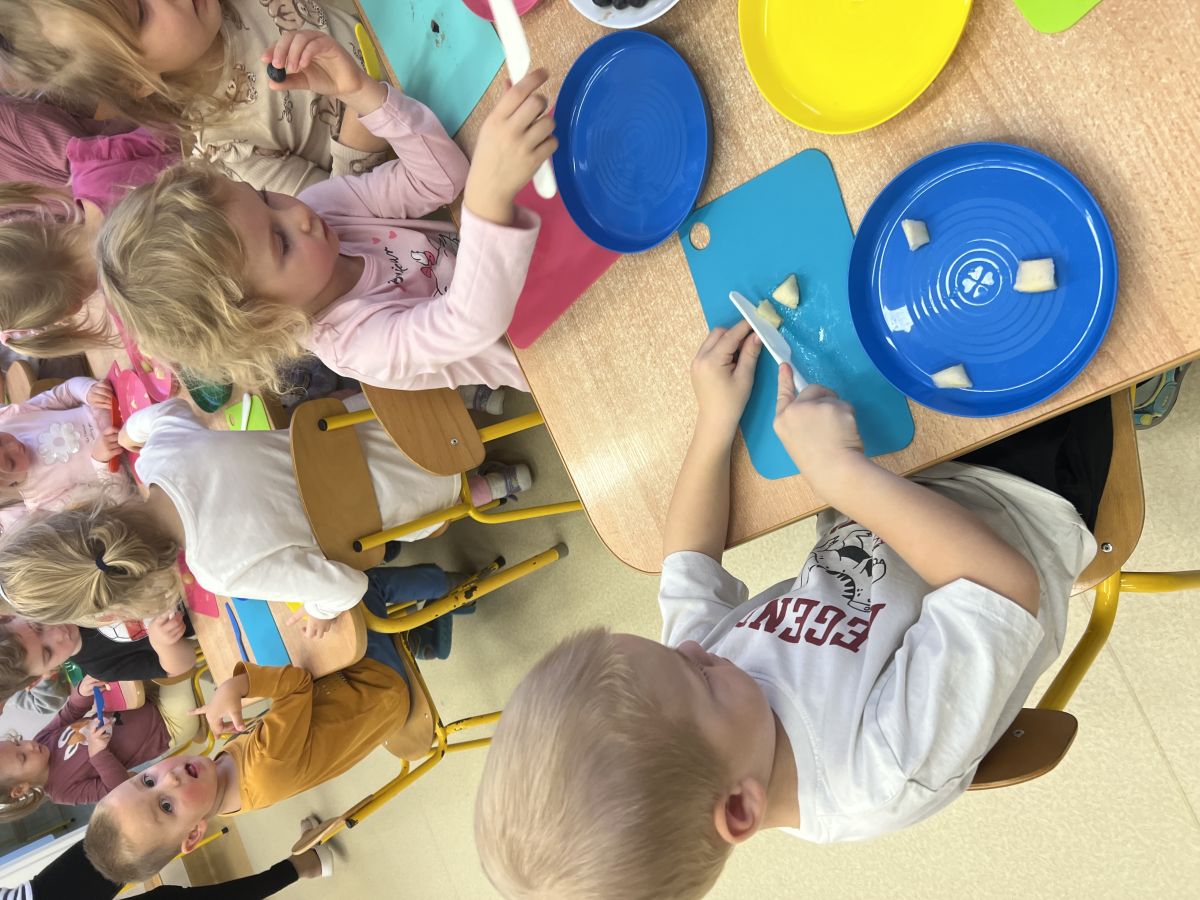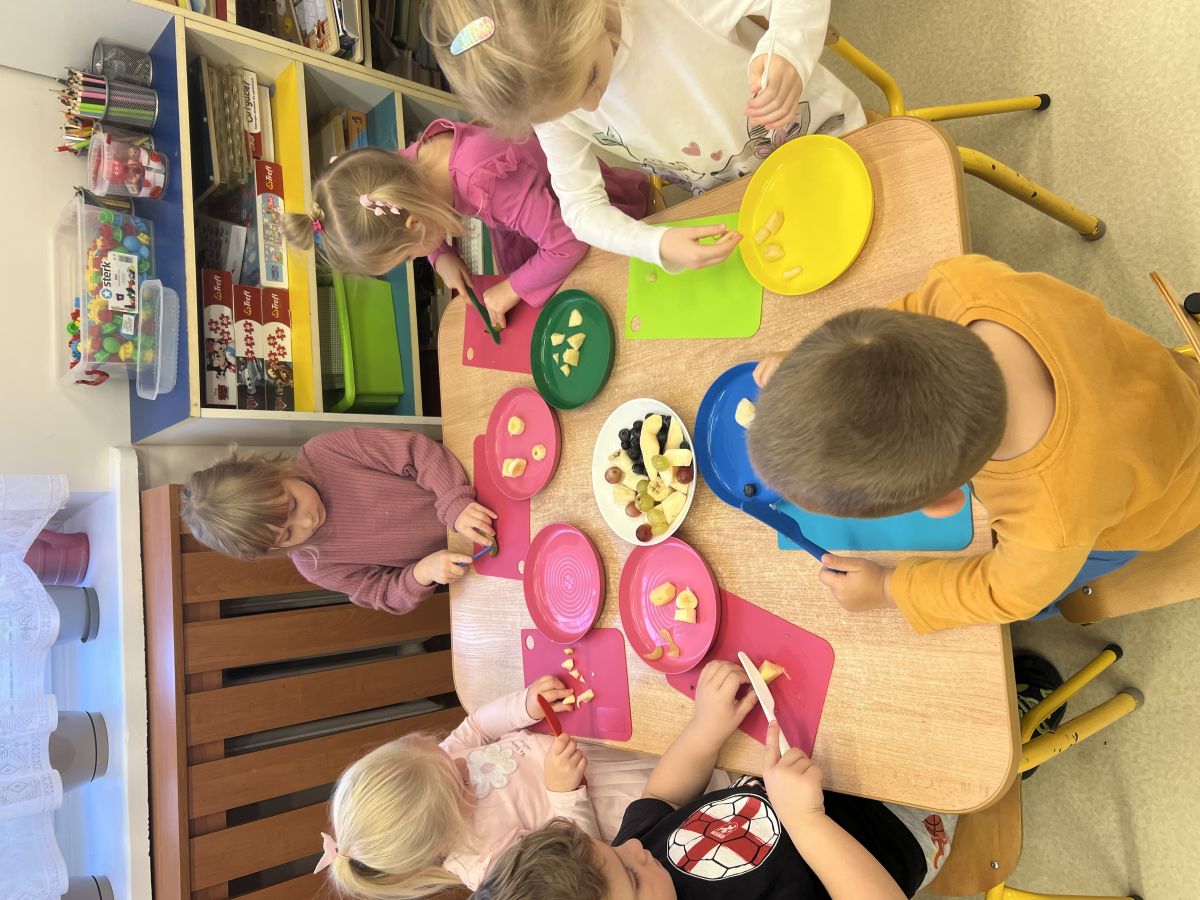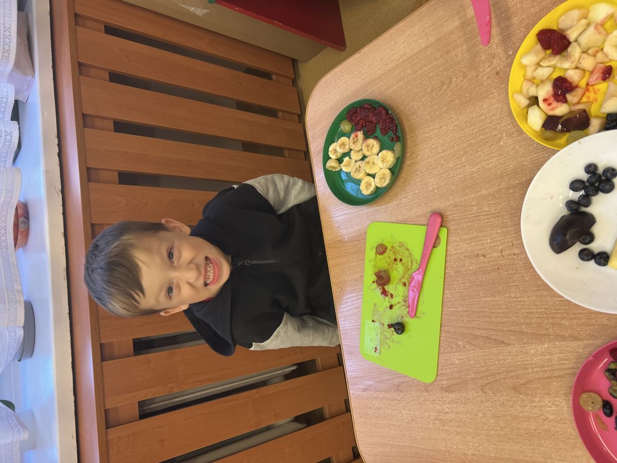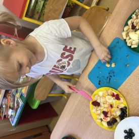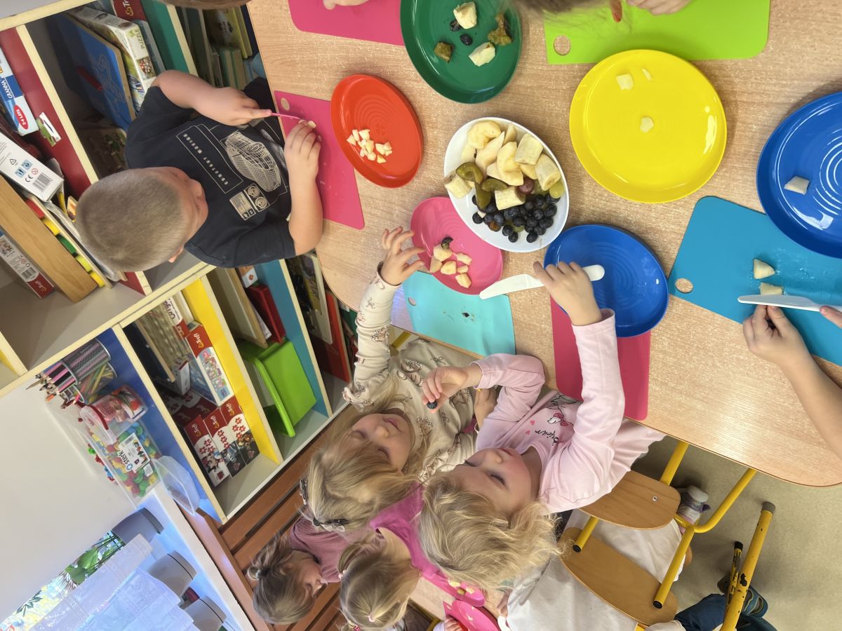 Dziś w grupie drugiej małe zuchy ćwiczyły swoje rączki podczas krojenia owoców na sałatkę owocową.Było pysznie 🥰