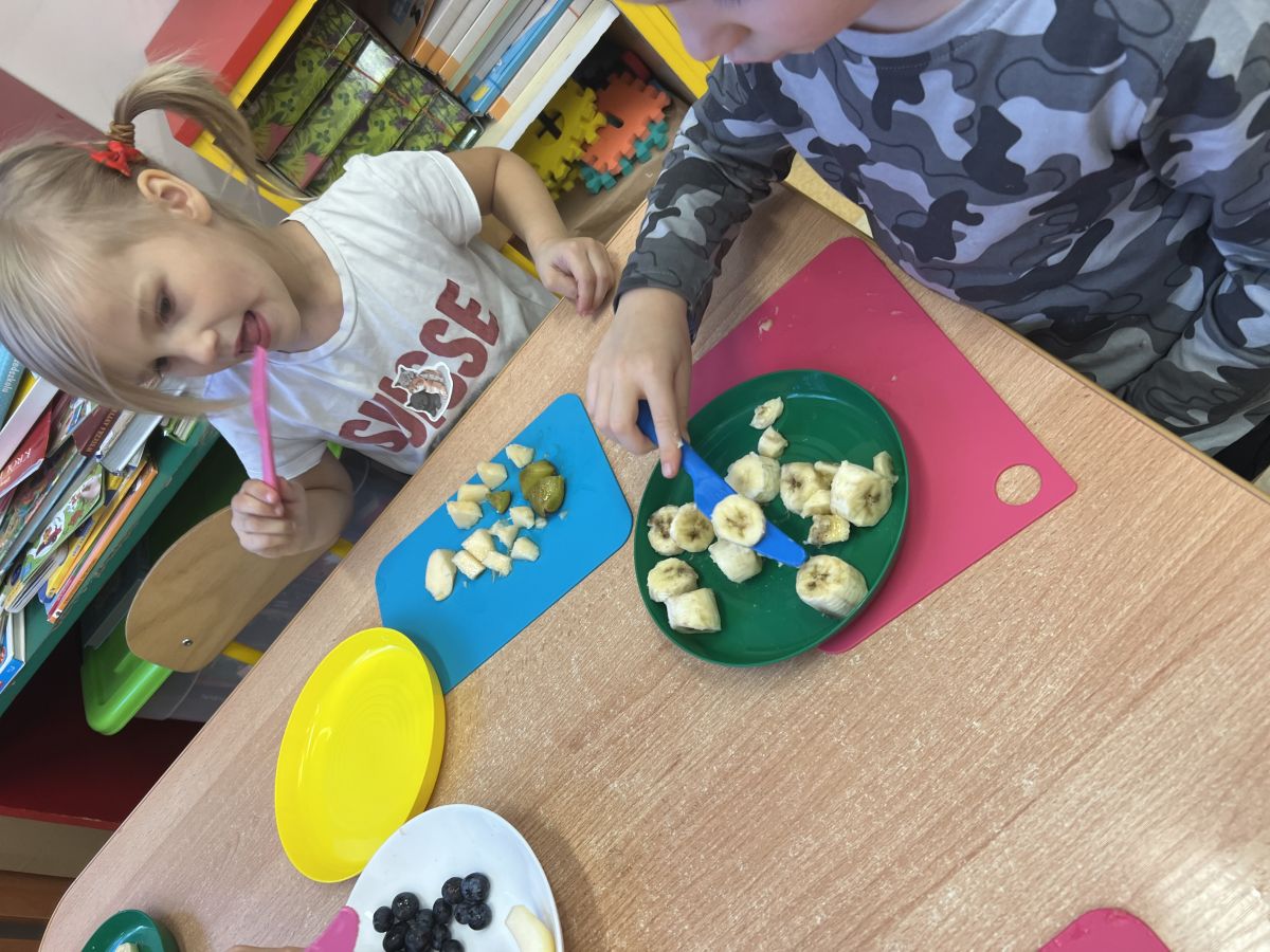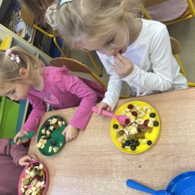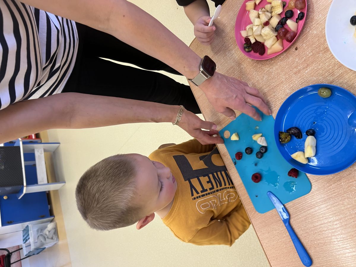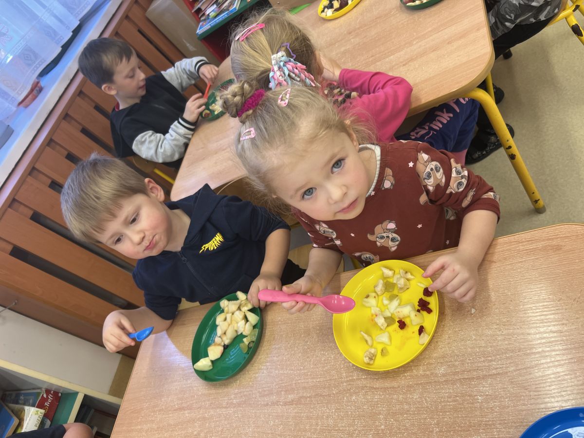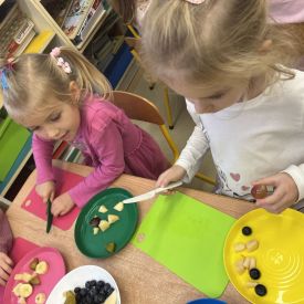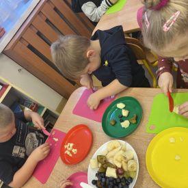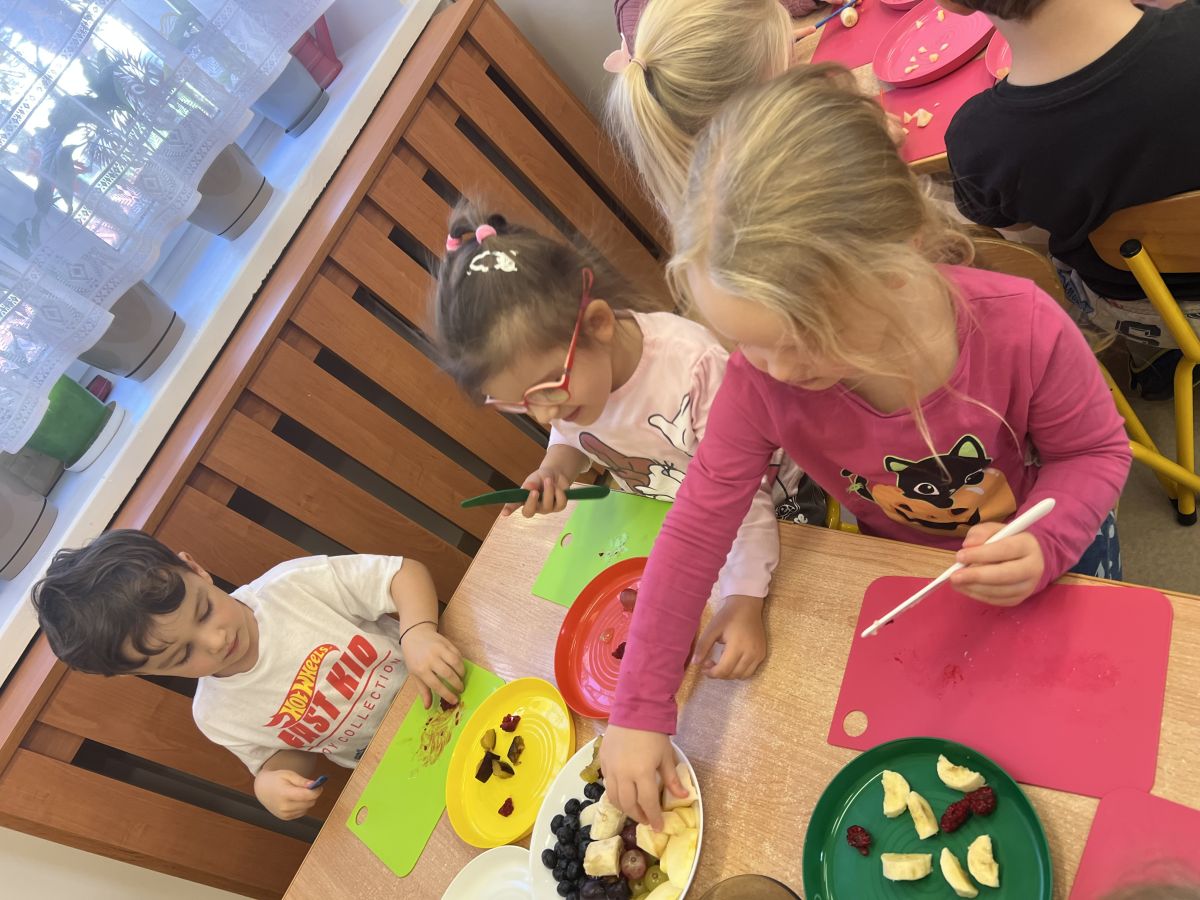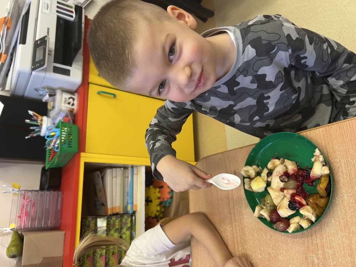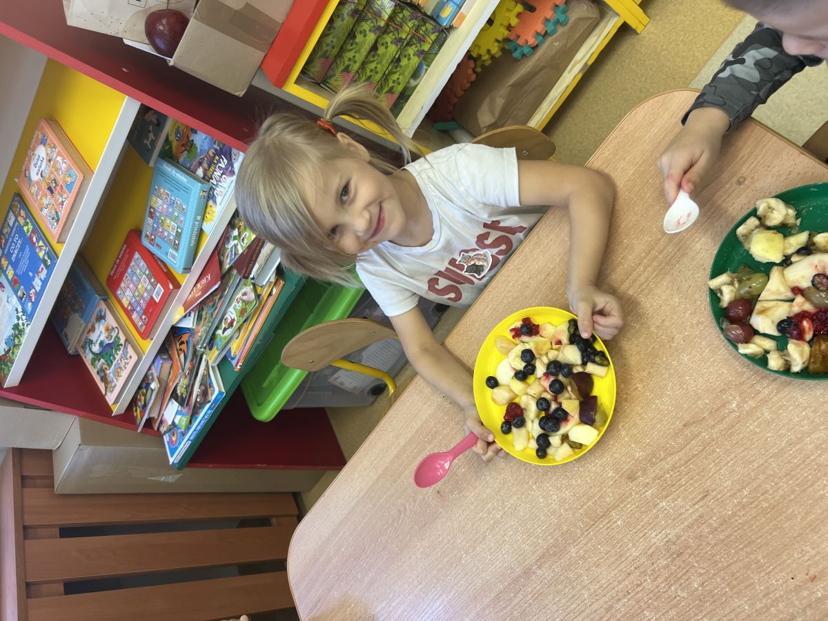 Dziś w grupie drugiej małe zuchy ćwiczyły swoje rączki podczas krojenia owoców na sałatkę owocową.Było pysznie 🥰
