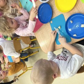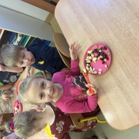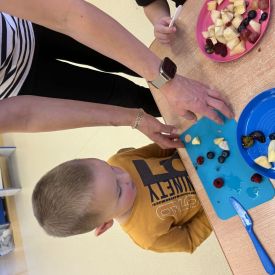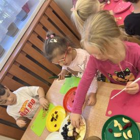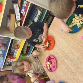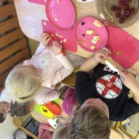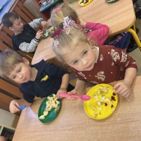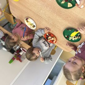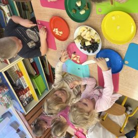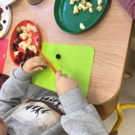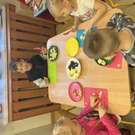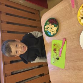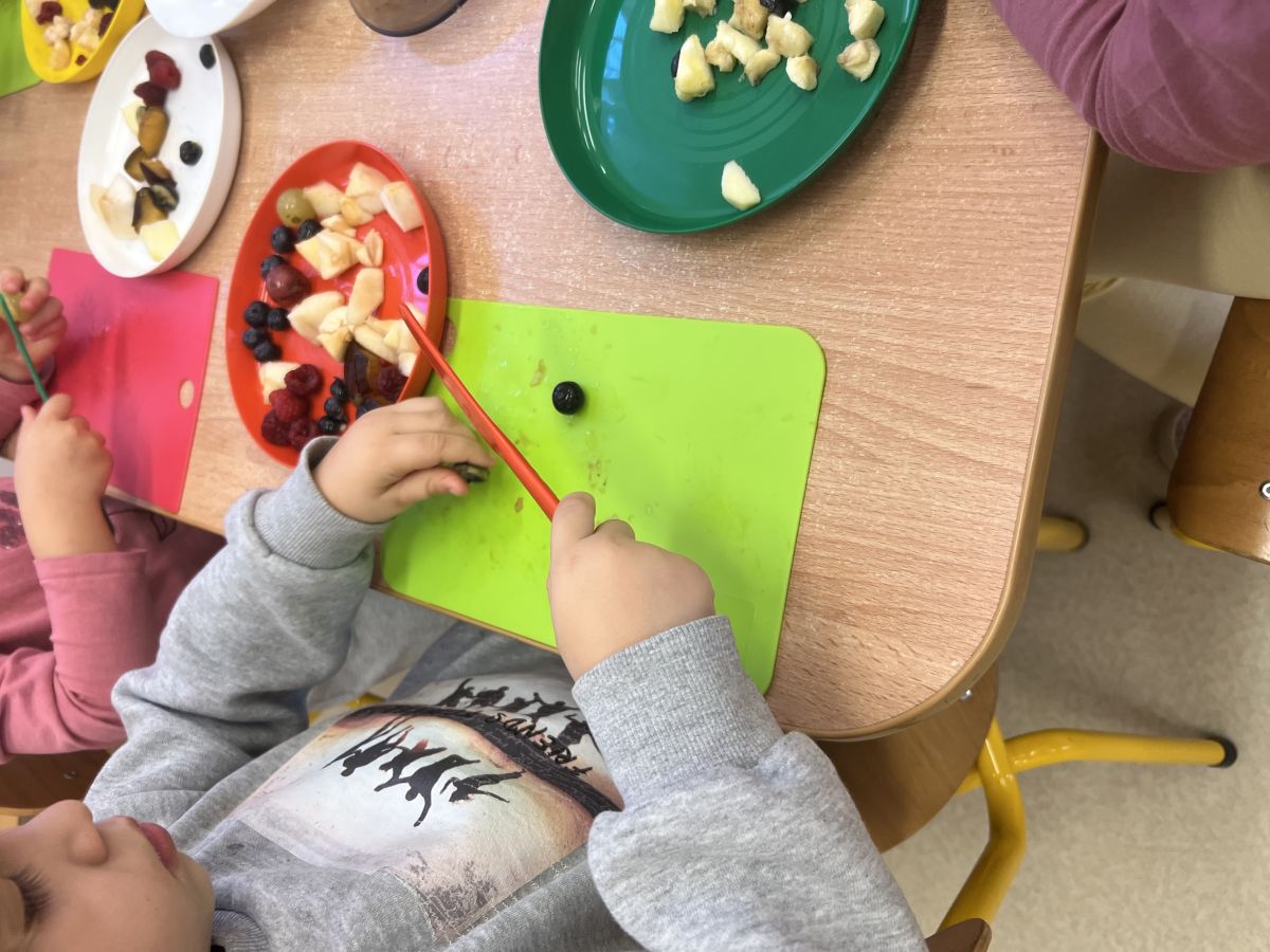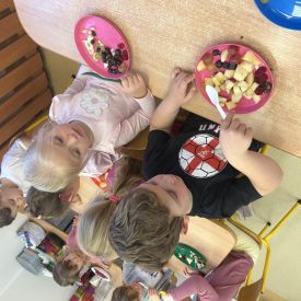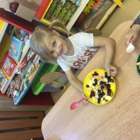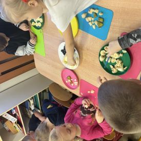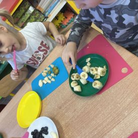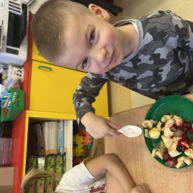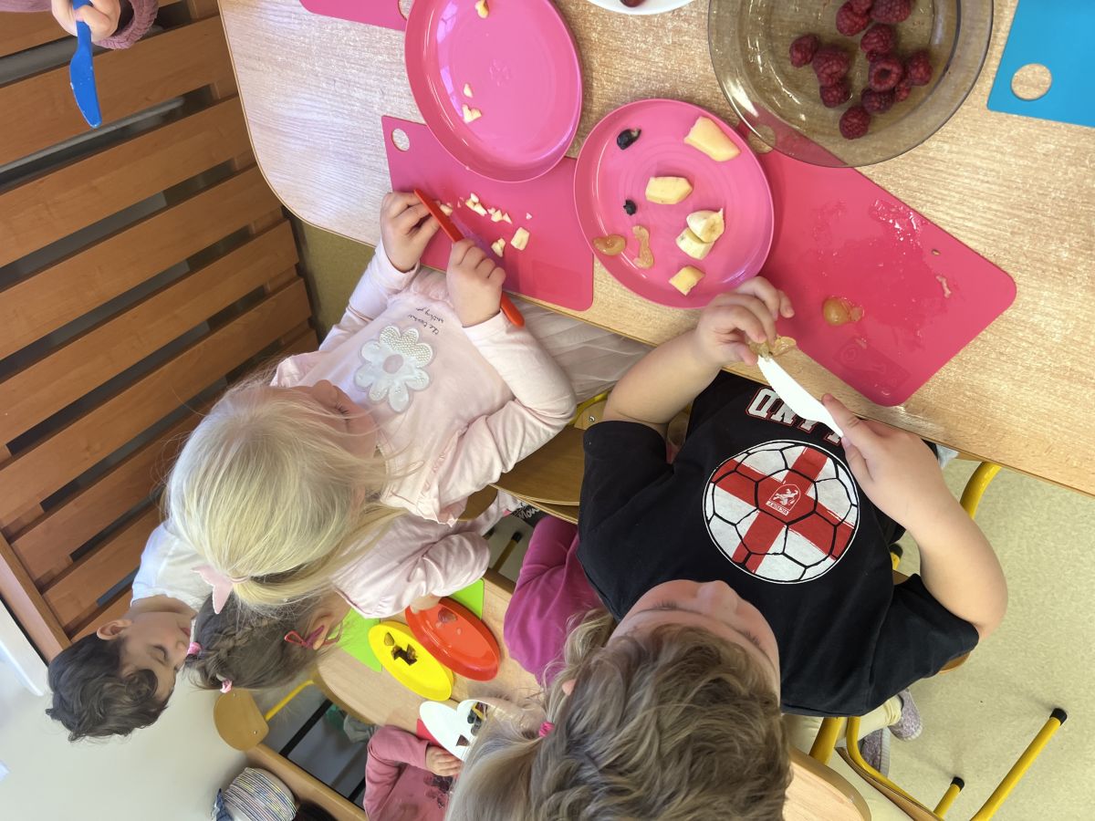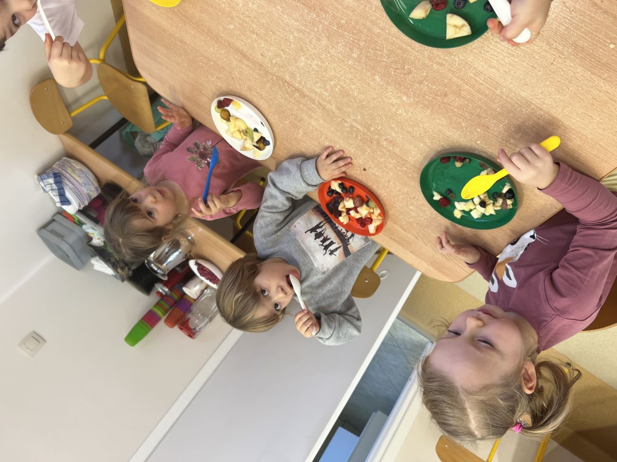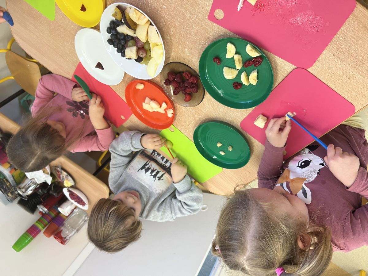 Dziś w grupie drugiej małe zuchy ćwiczyły swoje rączki podczas krojenia owoców na sałatkę owocową.Było pysznie 🥰